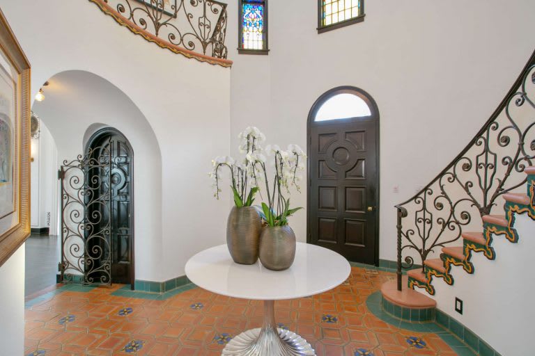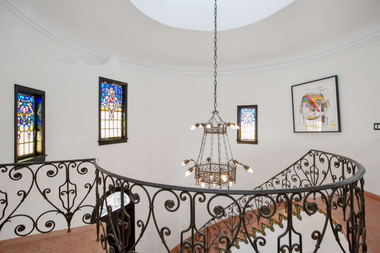 Tall casement windows and doors throughout the home bathe the rooms in natural light. A turreted entry sets the stage with original Malibu tiled floor and staircase, decorative ironwork, and a chandelier hanging from a cupola surrounded by original stained glass windows.