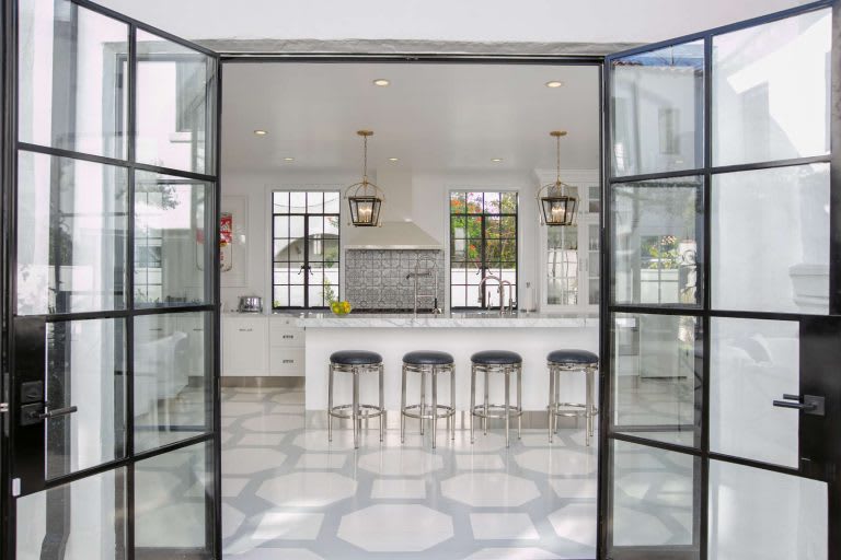 The sweeping formal dining room adjoins a vast, sunny kitchen updated with Miele, Wolf and Sub-Zero appliances. Hand-painted floors, a breakfast banquette and large windows brighten the ambiance. Broad casement doors open wide to the courtyard with its vine-shaded dining area and sun-washed seating patio. An en suite bedroom completes this level.