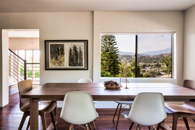 Sunlight from an array of windows touches its high faceted ceilings and burl wood floor throughout the day. Most windows frame sweeping vistas of the hills, night lights, and the San Gabriel Mountains.