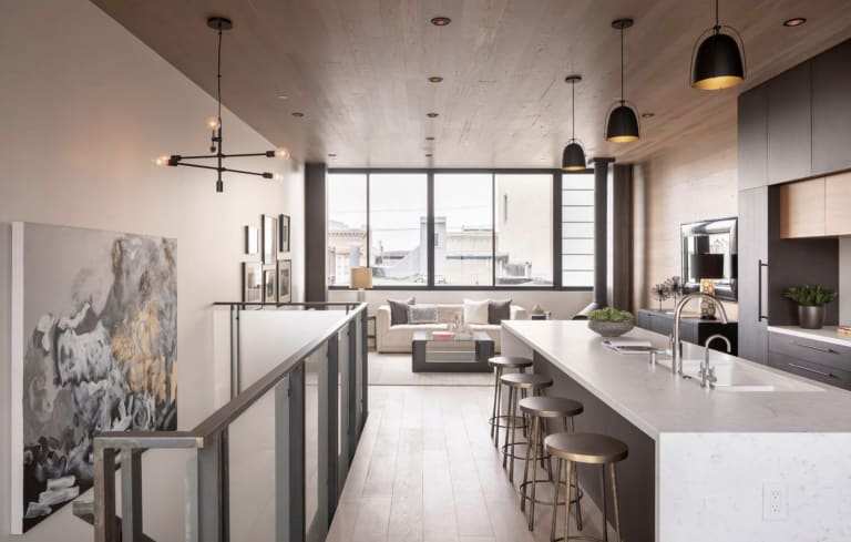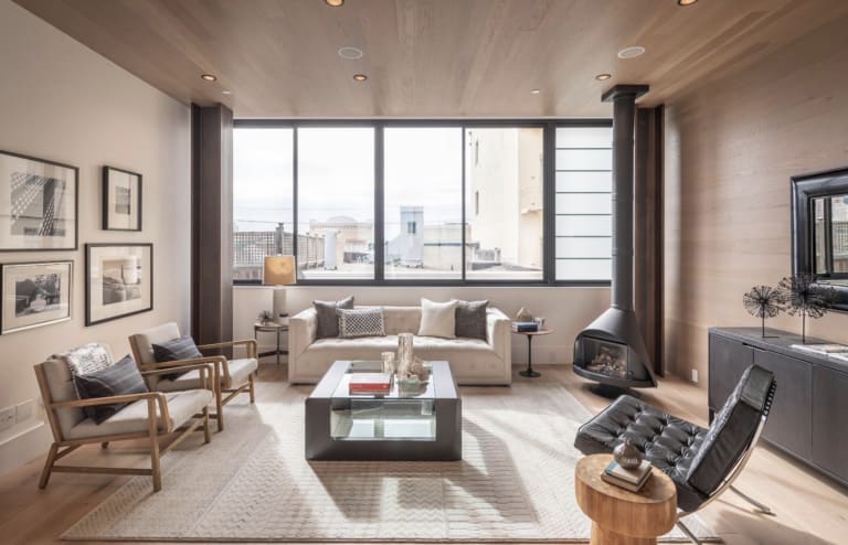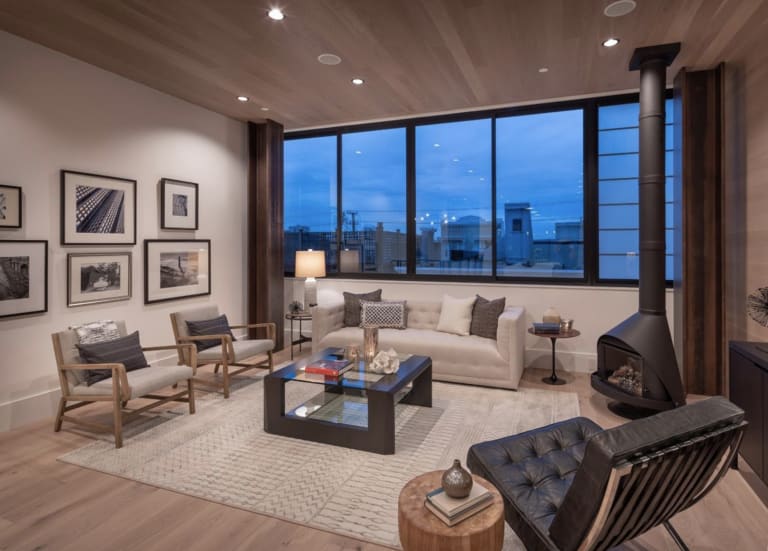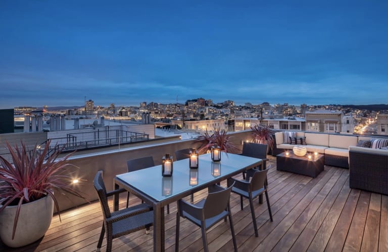 A freestanding gas fireplace adds ambiance in the living room. Just off the dining area, a spiral stairway ascends to the crowning touch: a spacious roof deck with panoramic views of urban San Francisco, city lights, soaring towers, hills, and mountains.