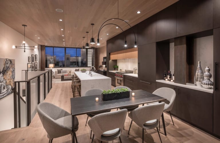 The three-story residence, constructed with steel moment frames, fuses contemporary style, fine craftsmanship, and the latest amenities. The open living/dining/kitchen space claims the top floor to maximize light and take advantage of the enchanting views.