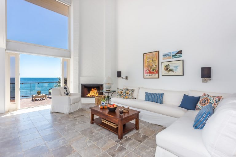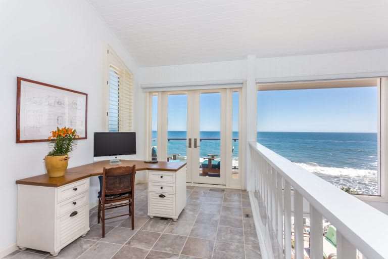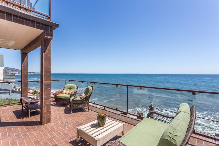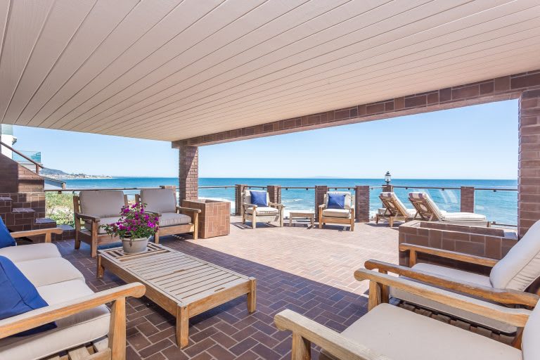 Views sweep from Point Dume to the Palos Verdes Peninsula, showcased in 1,200 square feet of outdoor living space on two levels.