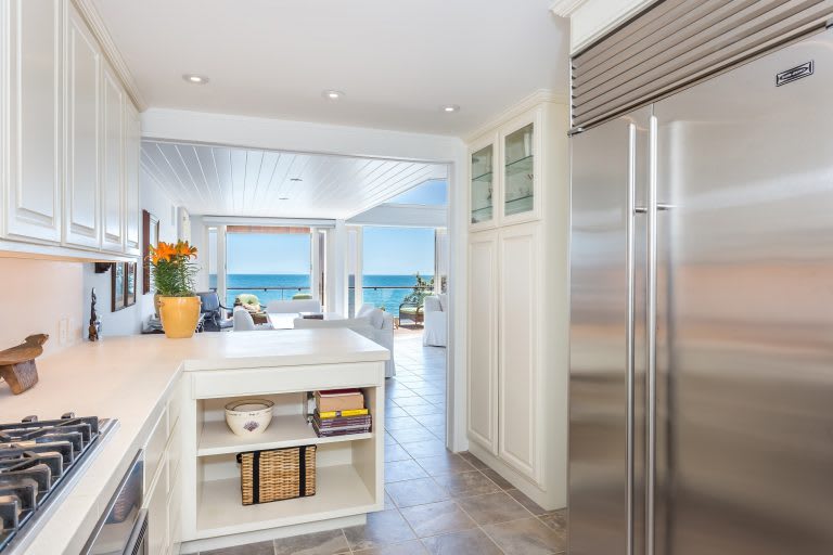 The upgraded cloud-white kitchen is equipped with Sub-Zero, Bosch and Viking appliances. A garden window adds natural color and light, while pull-up counter seating makes beach breaks fast and easy.