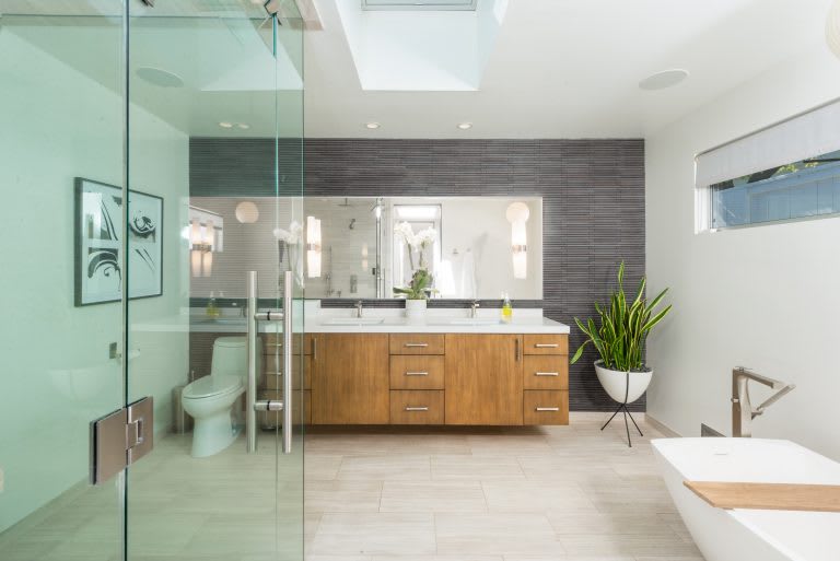 The tranquil master bedroom suite includes solar powered skylight highlighting the master bath’s soaking tub, handmade Japanese tile, and steam shower for the ultimate in-home spa experience.