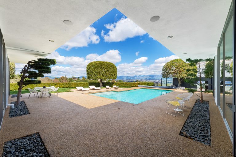 Beyond the gorgeous over-sized front doors and the original terrazzo floors, pause to take in every architectural line, angle. A swimmer’s pool overlooks the breathtaking views of the San Fernando Valley.
