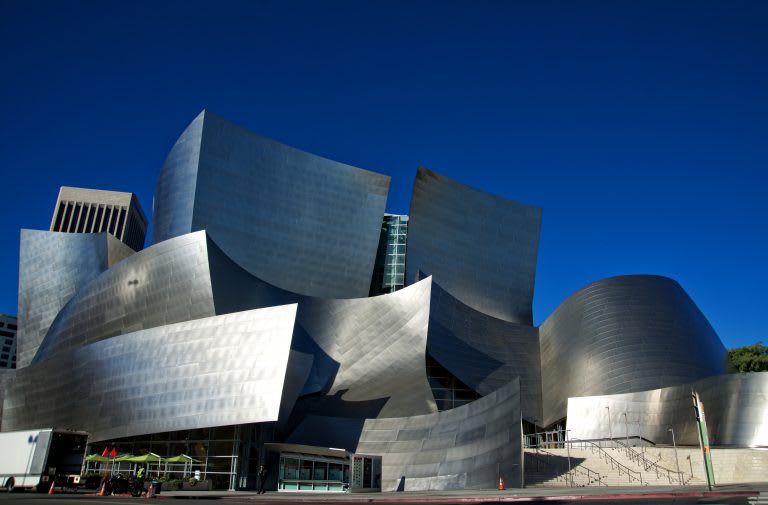 Exterior of the Walt Disney Concert Hall designed by Frank Gehry. It opened on 2003, as the home of the Los Angeles Philharmonic orchestra and the Los Angeles Master Chorale.