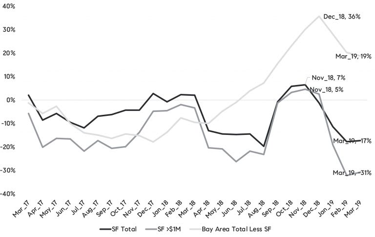 To illustrate San Francisco sellers’ response, Figure 2 tracks monthly year-over-year changes in for-sale home inventory in San Francisco overall, San Francisco inventory below $1 million, and overall Bay Area without San Francisco. The black line is highlighting the relative drop in San Francisco inventories below $1 million in the last two months, after a short three-month increase during the winter months.