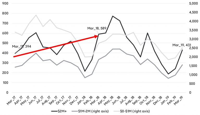 - Sales priced over $2 million have slowed notably compared to 2018, down 25 percent YOY in Q1, but still above 2017 levels.