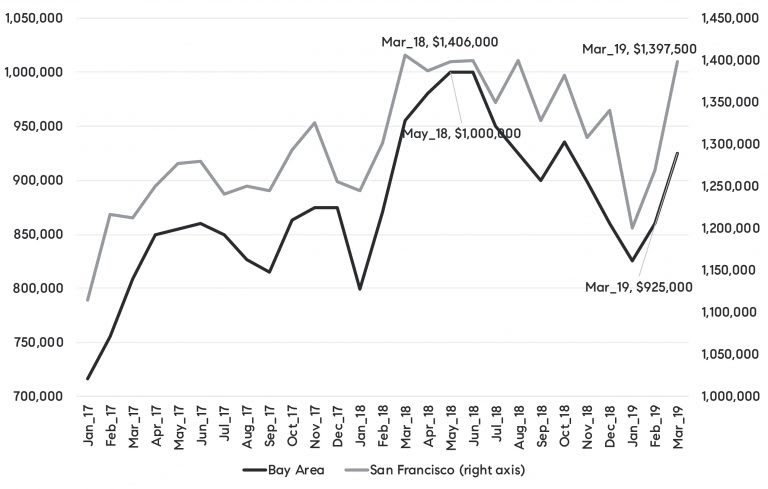 While anticipations are running high on how Lyft and Uber IPOs may affect Bay Area housing markets, particularly San Francisco, median home prices remain below last spring’s high. Note that beginning in fall 2017, median home price growth started accelerating at double digit rates, reaching as much as 18 percent year-over-year growth in March. Median prices peaked in May 2018. Price growth has moderated since then, and more recently fell below last year’s levels. However, as noted above, the share of higher-priced sales also declined since last summer peaks, thus more lower-priced sales are affecting the mix of sales and lower year-over-year rates. Figure 3 illustrates median price trend in San Francisco and the Bay Area overall. While a seasonal increase in home prices from January lows is evident across the Bay Area region, San Francisco and Marin (not in chart) experienced a relatively higher jump than in other areas, with San Francisco jumping 16 percent, Marin 21 percent, and the overall Bay Area 12 percent. Still, none of these suggest any trends as seasonal jumps of that magnitude have been historically consistent.