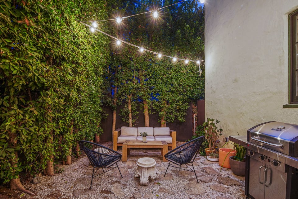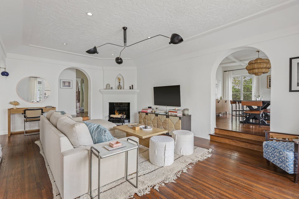 The upper unit impresses with a dramatic pitched beamed ceiling, a decorative fireplace, and a spacious deck offering sweeping views of the Hollywood Hills — an idyllic setting for relaxing or entertaining outdoors. The lower unit offers a generous living room with its own decorative fireplace and easy flow access to a charming yard with mature trees, perfect for cozy private evenings under the stars.